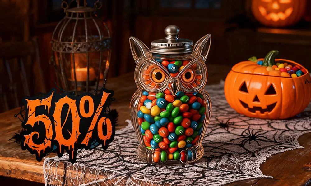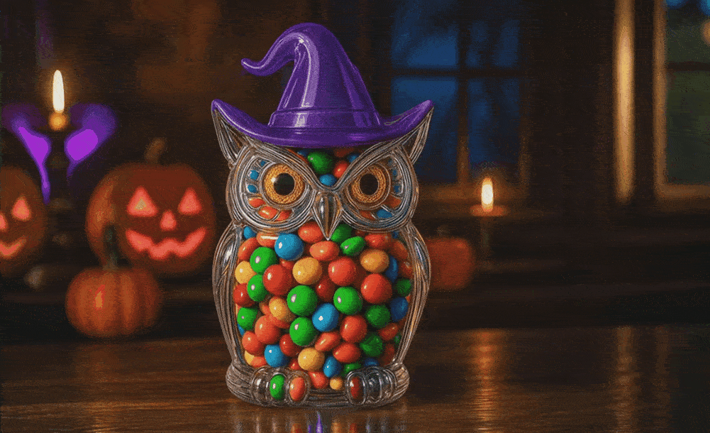 ✔️ On Halloween, the owl glows with M&Ms and chocolates, catching the candlelight just right.