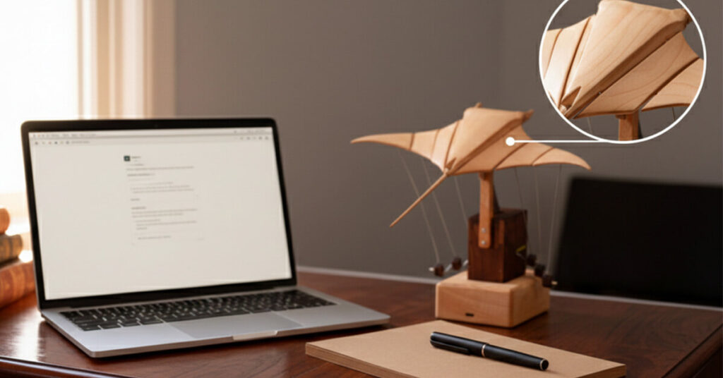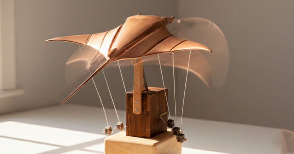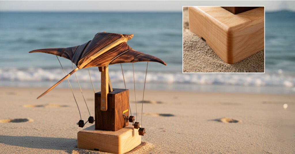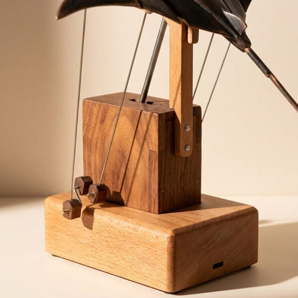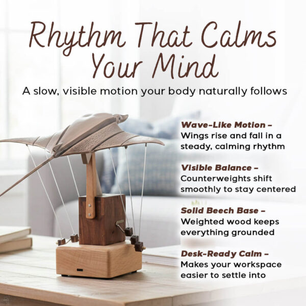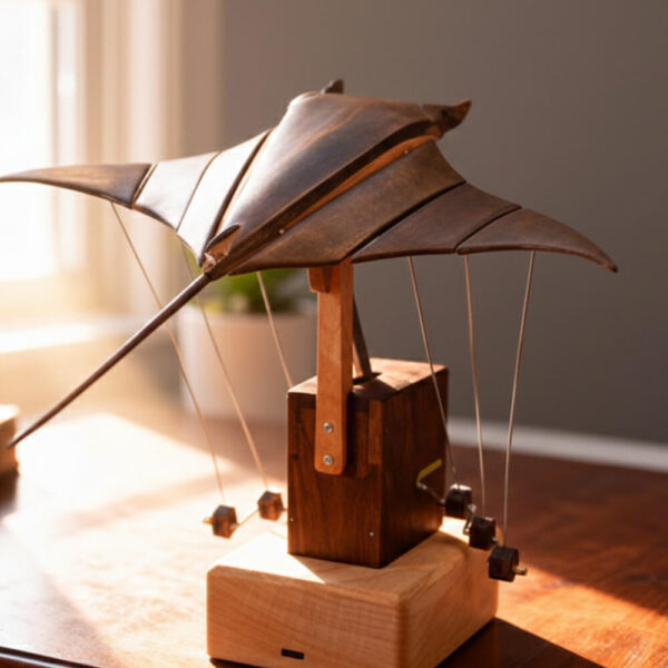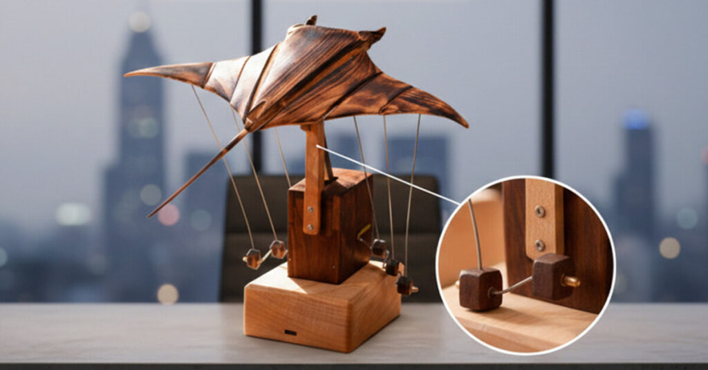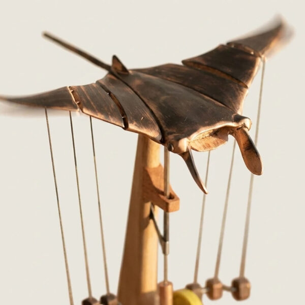 Nothing about how AerisRay works is hidden. You can see the fine lines holding the manta ray, watch the tiny counterweights shift below, and follow how tension moves through the whole structure as it glides. When the wings lift, the weights respond. When one side tilts, everything adjusts to stay centered. It's mechanical poetry you can actually observe, like watching an old inventor's prototype come to life right on your desk.