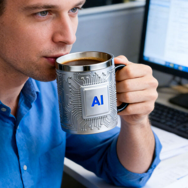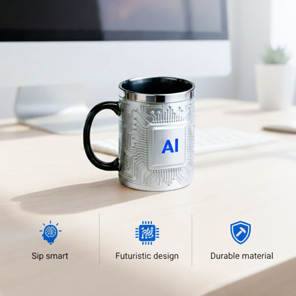 The mug features a durable metal exterior with a sleek, industrial finish, designed to feel solid and premium in hand. The exterior is crafted to resemble a high-performance AI processor, complete with etched circuit detailing and a bold central “AI” emblem.