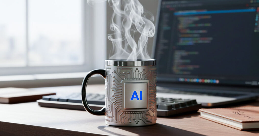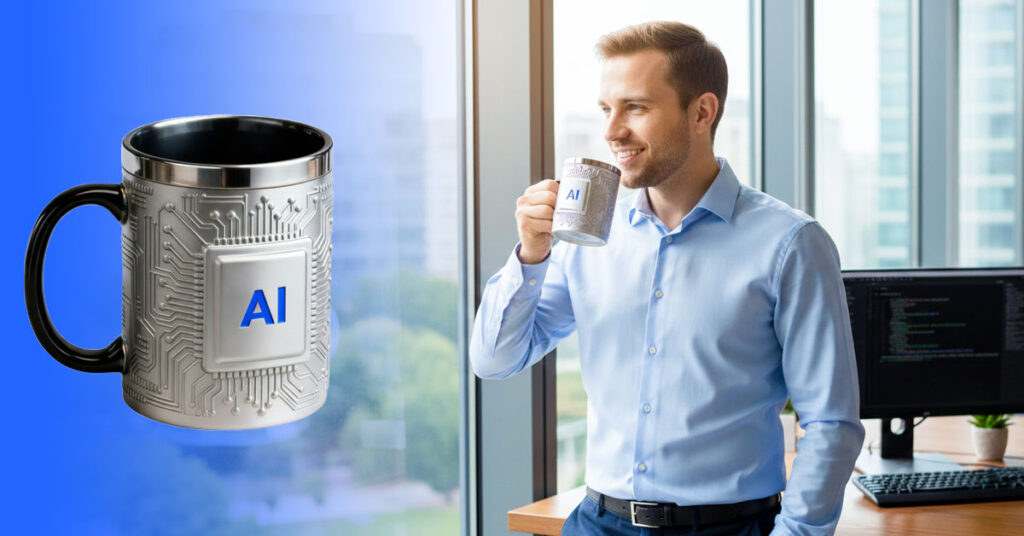 The mug features a durable metal exterior with a sleek, industrial finish, designed to feel solid and premium in hand. The exterior is crafted to resemble a high-performance AI processor, complete with etched circuit detailing and a bold central “AI” emblem.
