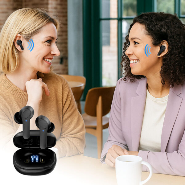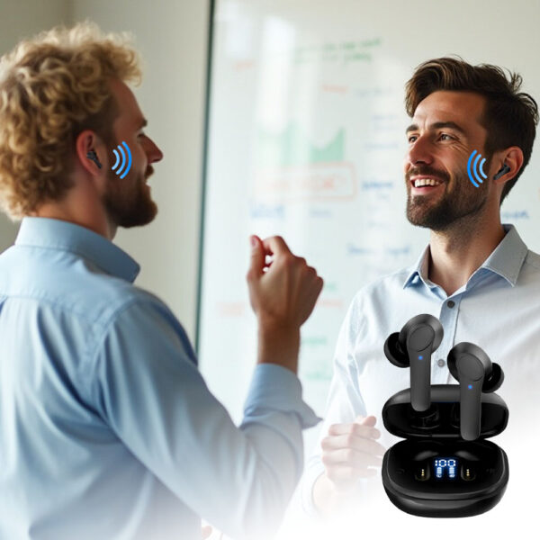 Battery life is typically several hours of continuous use—enough for conversations, meetings, or travel. The charging case provides additional power to recharge the earbuds on the go.