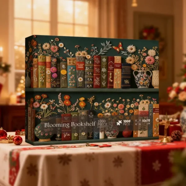 It’s a 1,000-piece premium jigsaw puzzle featuring a stunning embroidered-style bookshelf scene filled with books, tiny vases, and blooming flowers. It’s designed not only to calm the mind during assembly but also to be framed as elegant wall art once completed.