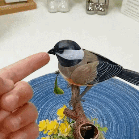 Its lifelike beak opens and closes, the wings flutter gently, and the soft chirps feel like they came straight from a sunlit forest.
