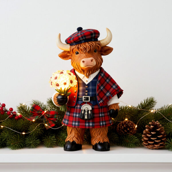 This charming Highland cow wearing tartan and holding flowers naturally draws people in. Guests will notice it immediately, smile without thinking, and probably ask where you found such a delightful little character. It's the kind of unique piece that breaks the ice, sparks stories, and gets people talking about travels, memories, and the simple things that bring happiness.
