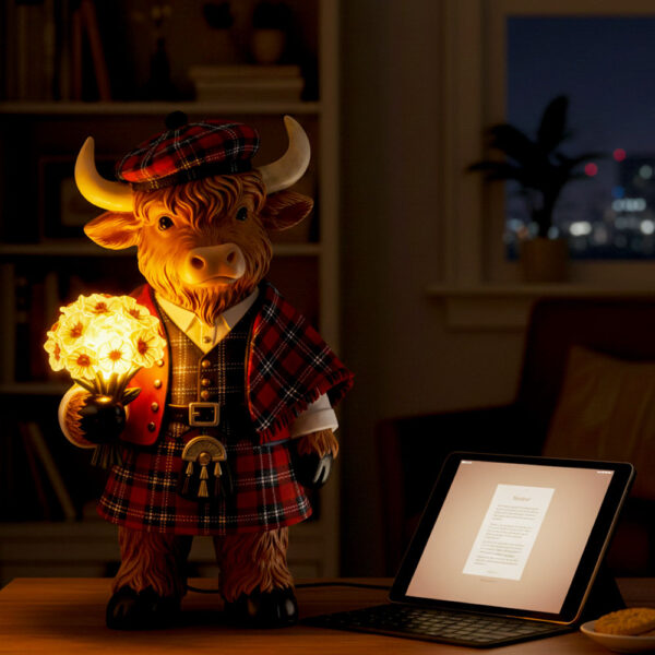It’s a handcrafted decorative lamp featuring a charming Highland cow holding a bouquet of flowers. It emits a soft, warm glow—adding comfort, character, and gentle joy to any room. Part artwork, part night light, part heartwarming reminder of love and home.