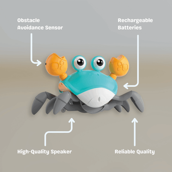This little crab is smarter than it looks. Built-in sensors in the claws can tell when tiny hands are getting close, so it scoots away just enough to keep the game going. It's like having a playmate that knows exactly how to keep your baby motivated to keep crawling and reaching. The perfect balance of "almost got it" that turns tummy time into an exciting chase.