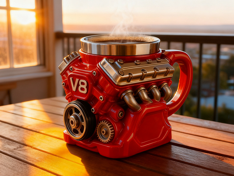 It’s a handcrafted, highly detailed, 3D coffee mug modeled after a classic V8 engine block. Designed by artisans and engineers, it blends functional drinkware with automotive art, making every sip feel like firing up an engine.