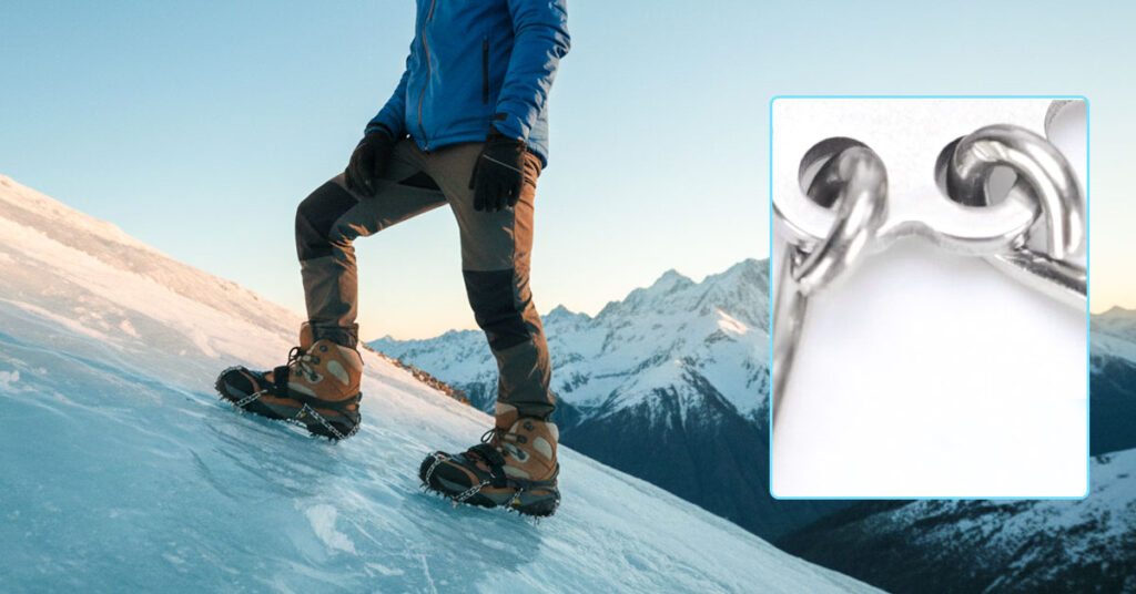 Here's what makes this different: six double chains wrap around your boot and connect every spike together. They're welded, not just linked, so there's no weak point that can pop open. When you step on uneven ice or take a corner, these chains keep your foot from sliding sideways—that's usually when people fall. The chain network distributes force across the entire crampon, so one spike doesn't take all the pressure and fail.