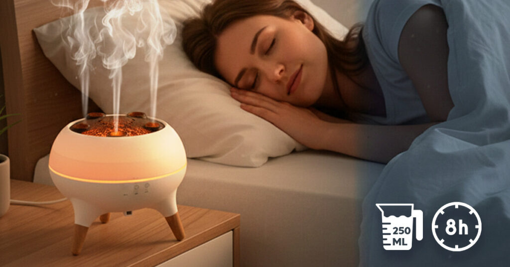 The large 250ml capacity provides up to 8 hours of continuous misting on a single fill. Set it up once in the morning for all-day coverage, or fill before bed for overnight use. This generous tank size eliminates frequent refilling that smaller diffusers require every few hours.