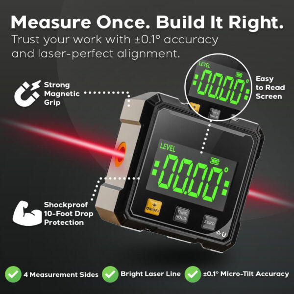 It offers ±0.1° precision, making it far more reliable than traditional levels or manual angle finders. You can trust it for pro-grade results on cabinetry, framing, flooring, and more.