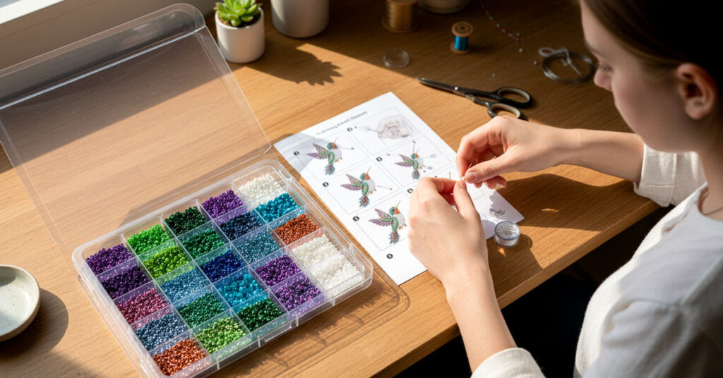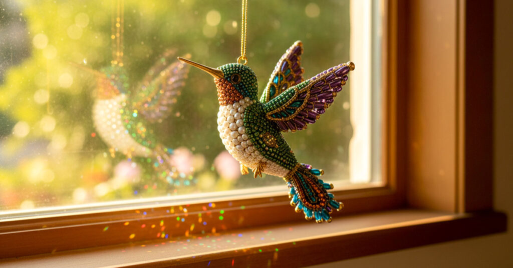 It’s a DIY beaded art kit that lets you create a shimmering hummingbird (or other symbolic animals) from high-quality, color-coded beads. The finished piece becomes a delicate, light-catching ornament or décor item.