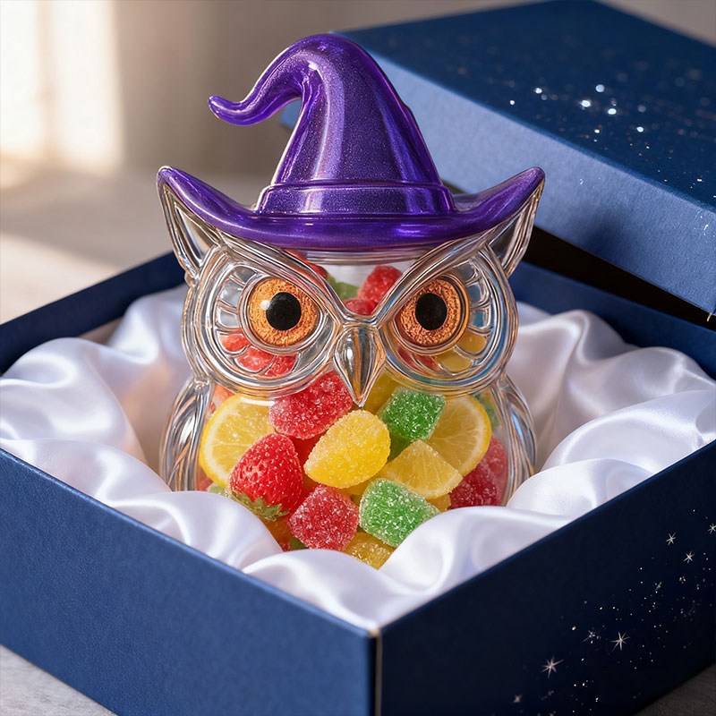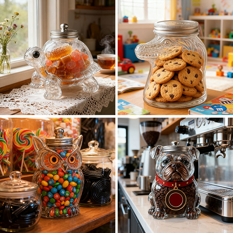 These are beautifully crafted glass jars with whimsical character designs (owls, ghosts, dragons, turtles, etc.), designed to store candies, treats, or other small items—while also doubling as decorative “magic friends” for your home.