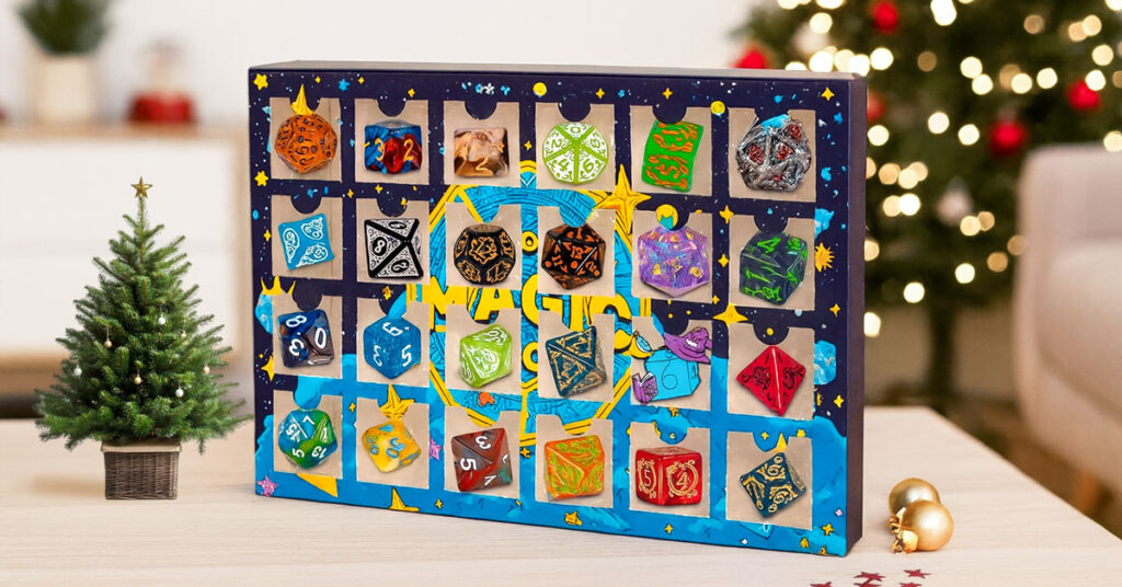 Picture opening a new surprise every single day from December 1st through Christmas Eve. Each numbered door conceals a different gaming die that you won't see until the moment you open it. The anticipation builds as you wonder what's waiting behind tomorrow's door - maybe a translucent blue d20 or a copper-colored d8 that catches the light just right.