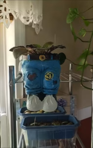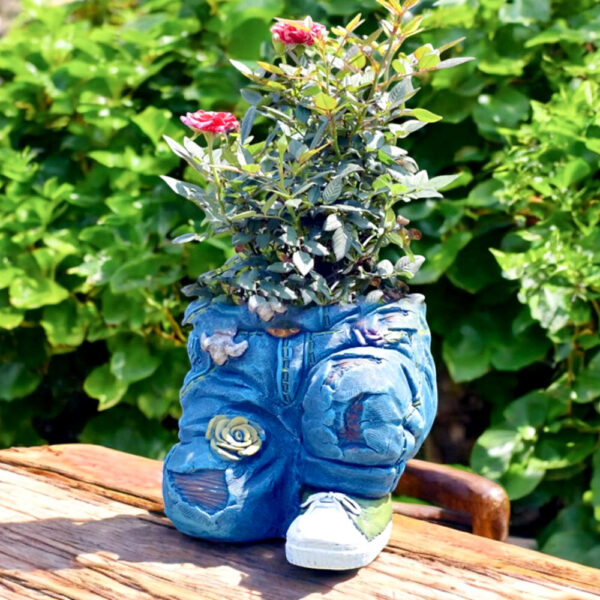The distressed areas are painted details that create the illusion of rips and worn patches - they're not actual holes through the material. The planter is solid resin throughout except for the intentional drainage holes at the bottom and the open top planting area. Soil stays contained. The artistic distressing just adds to the realistic denim appearance.