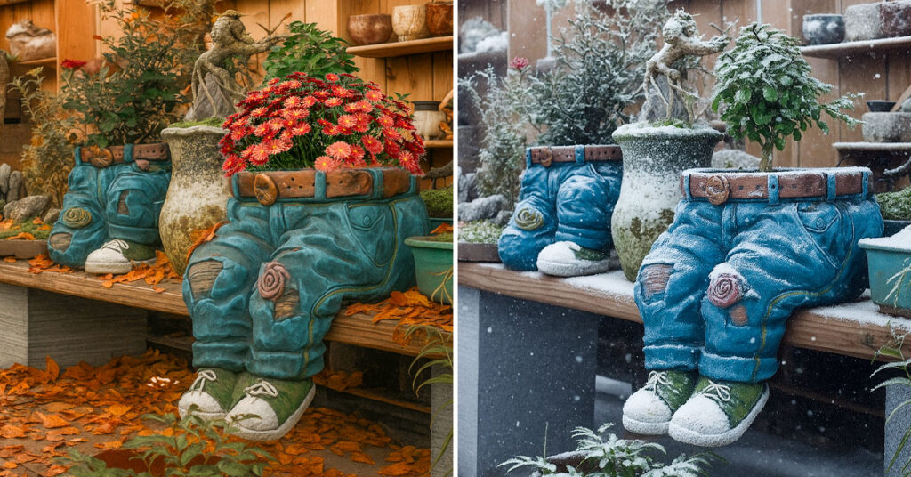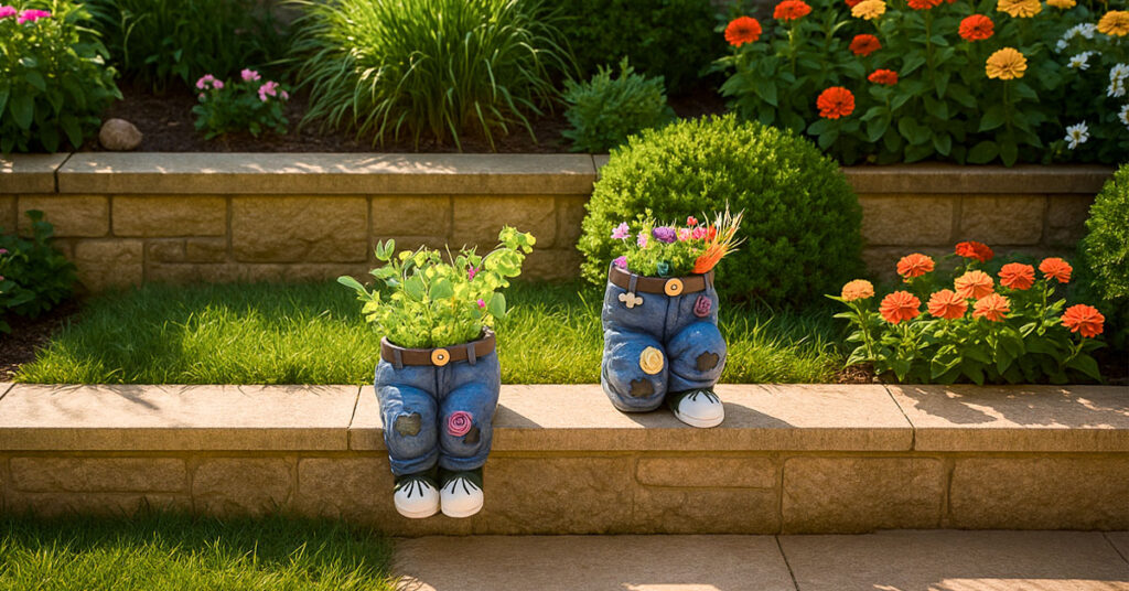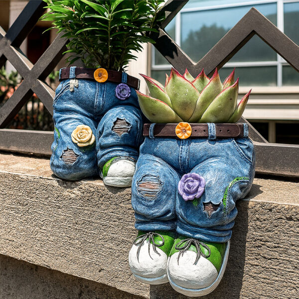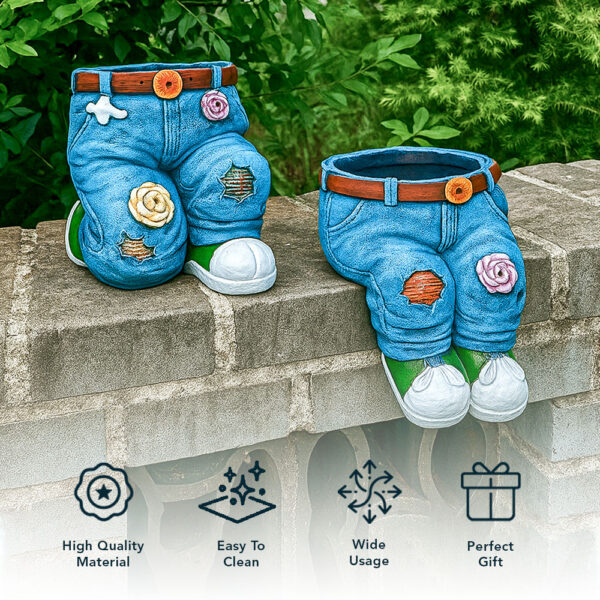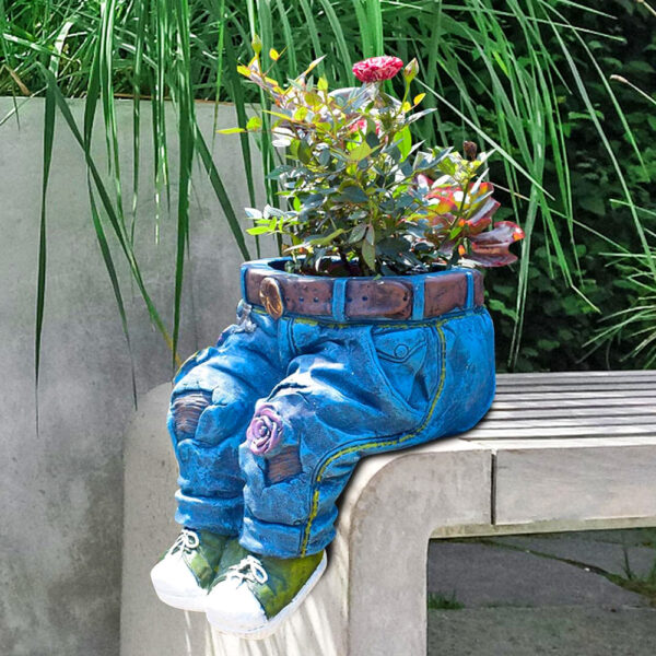 This is made entirely from weather-resistant resin material with a painted finish that mimics the look of distressed denim. It's not real fabric, so you don't have to worry about it rotting, molding, or deteriorating like actual jeans would. The paint is applied to look like denim texture, fading, and distress marks. Many customers have reported it holding up beautifully through full seasons outdoors.