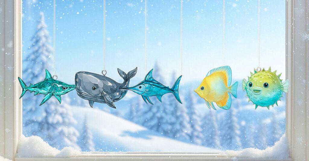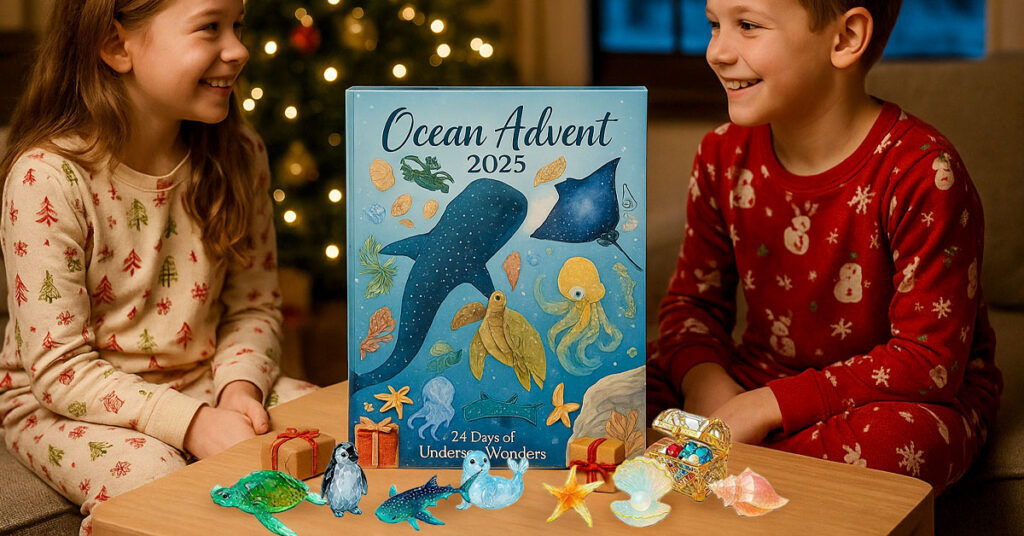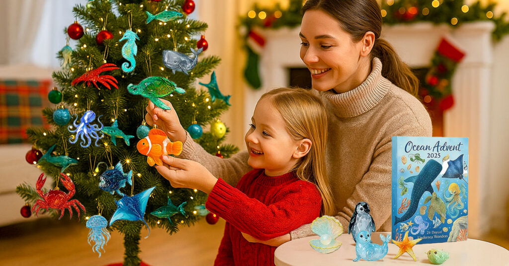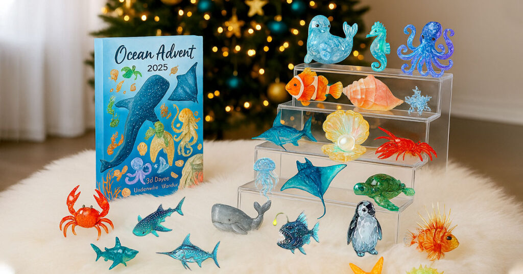 It’s a 24-day advent calendar where each day reveals a hand-painted, crystal-like ocean creature — such as whales, jellyfish, turtles, and seahorses. Each figure is crafted to shimmer softly in natural light, creating a calming visual display.