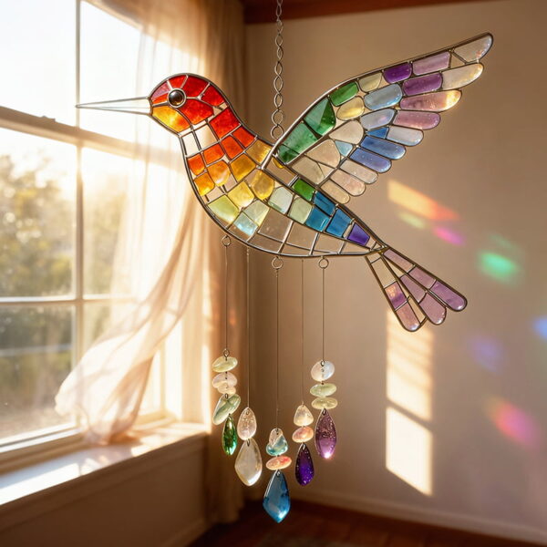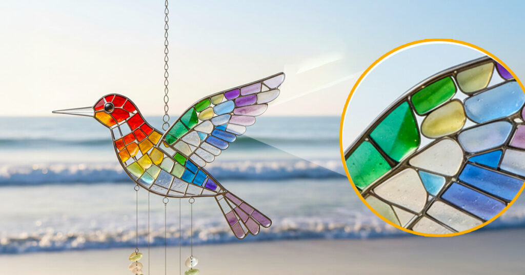 The OceanSpirit Bird is a handcrafted decorative hummingbird wind chime made from ocean-tumbled sea glass and durable metal.