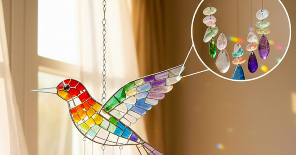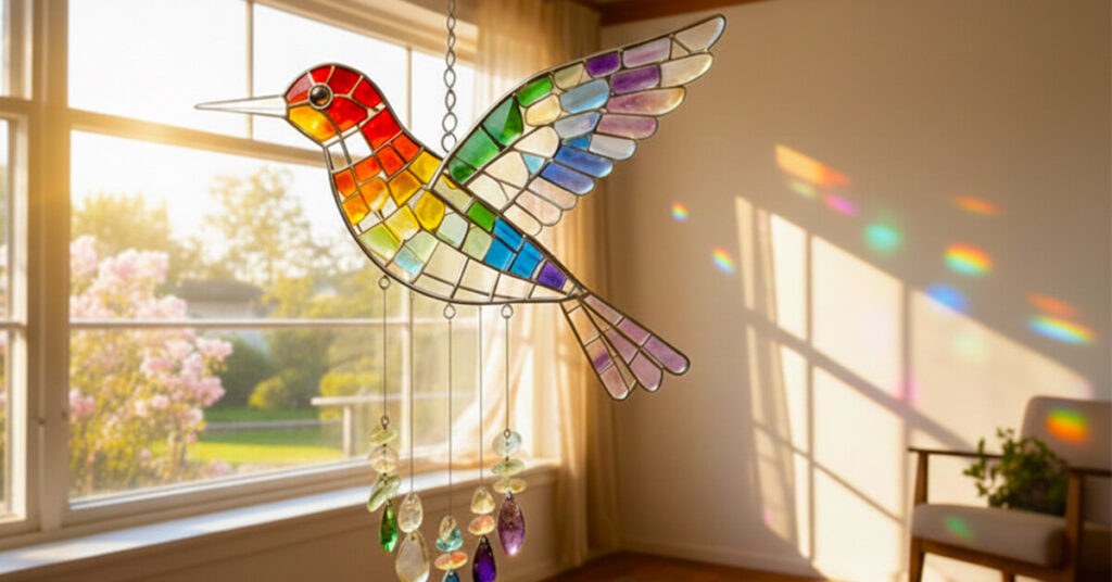 Here's the magic part: when sunlight hits those sea glass wings, it doesn't just sit there looking pretty. It creates actual prismatic reflections that move and shift across your walls throughout the day. Morning light gives you soft pastels. Midday brings vibrant bursts of color. Late afternoon casts warm, golden glows. It's like having a living light show that changes naturally with the sun's position—turning blank walls into something you'll catch yourself staring at while sipping your coffee.