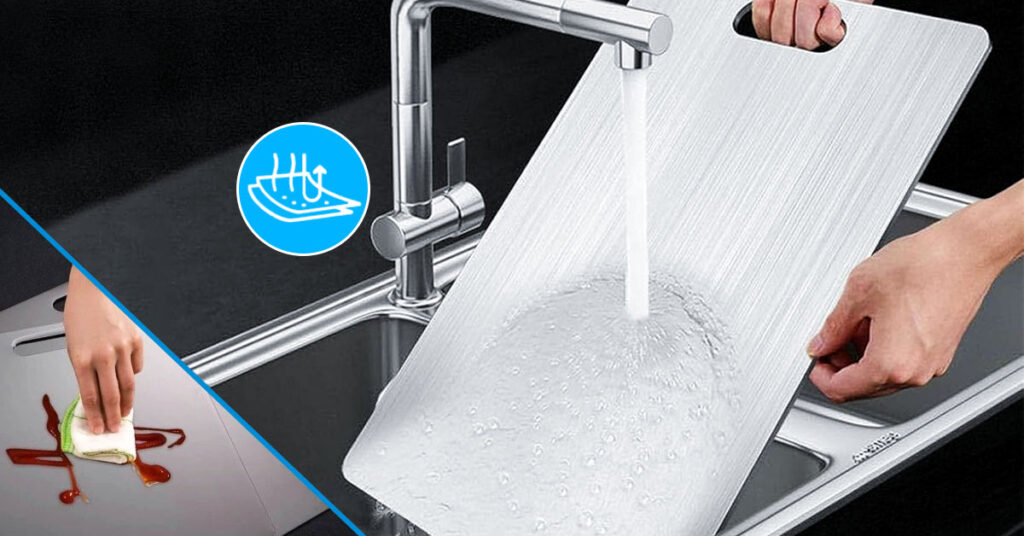 Simply wash it with hot soapy water and rinse—that's it. Because the surface is completely non-porous, bacteria can't penetrate or hide anywhere. For extra peace of mind, you can also put it in the dishwasher or quickly sanitize it with a diluted bleach solution, something you can't safely do with wooden boards.