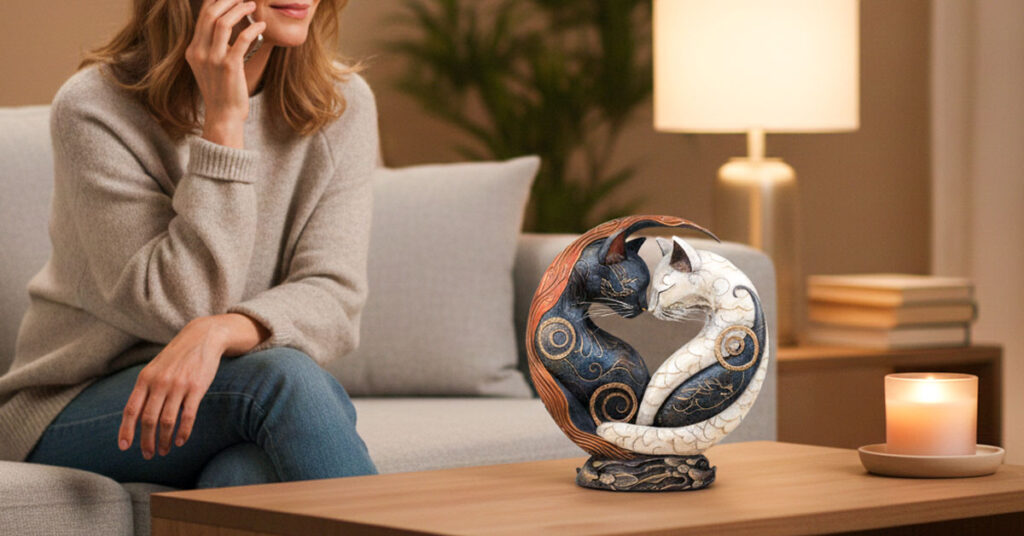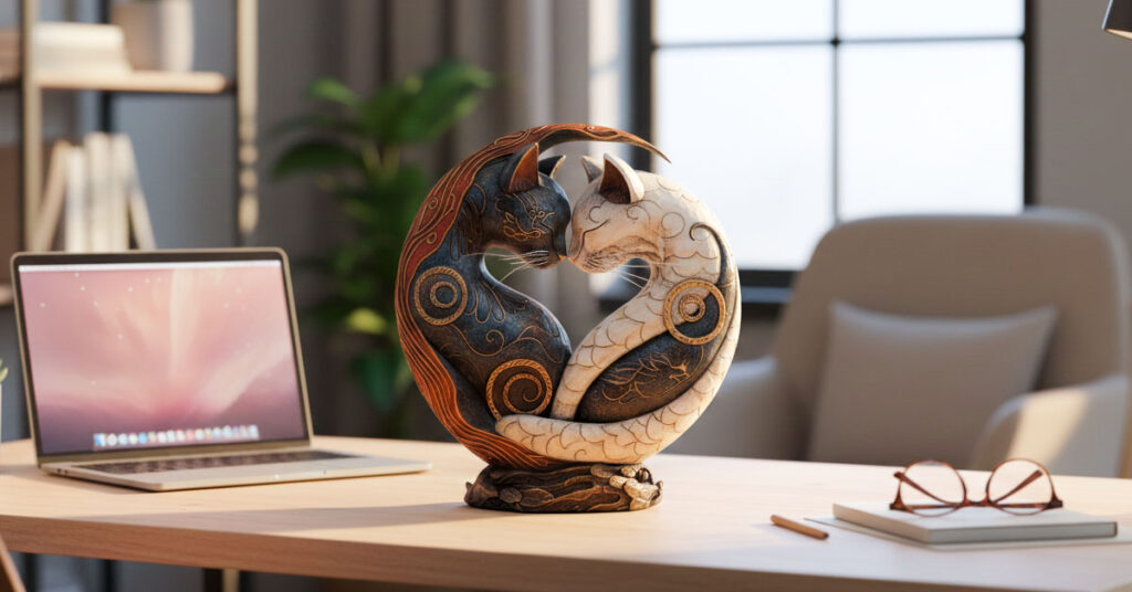 It’s a handcrafted resin sculpture featuring two cats — one light, one dark — curled together in a peaceful Yin & Yang embrace. Designed to create a calming, grounding atmosphere, it serves as both décor and a quiet emotional anchor in your space.