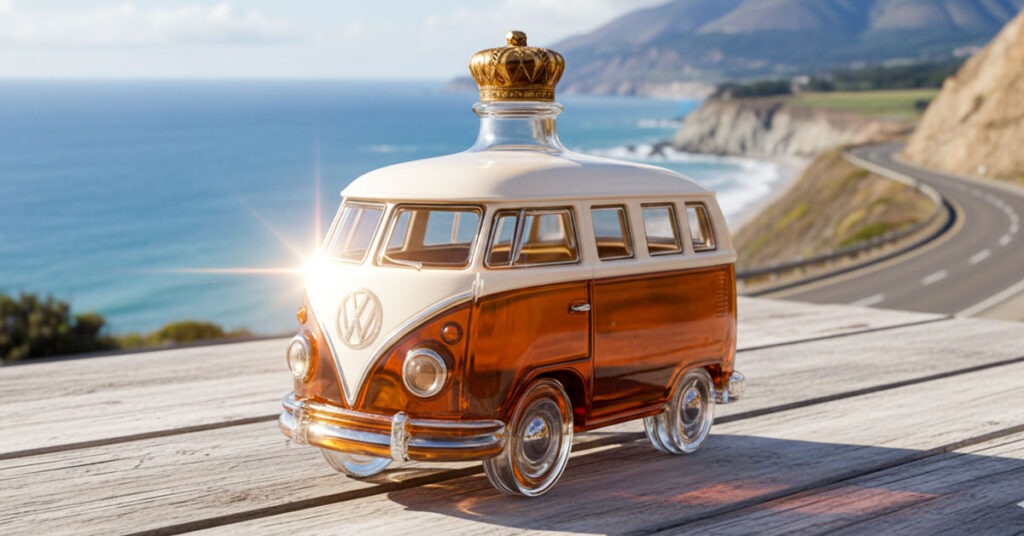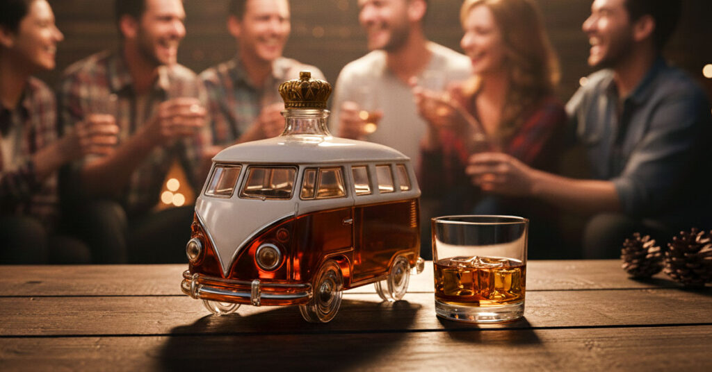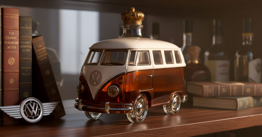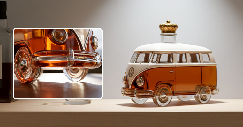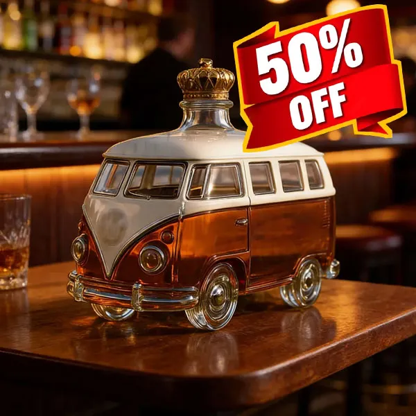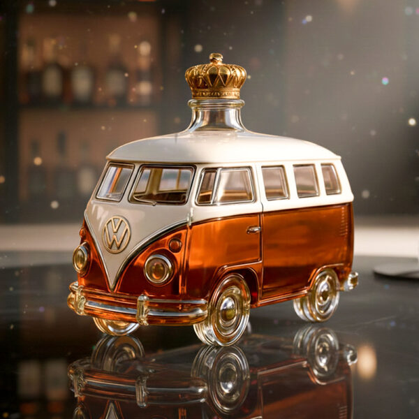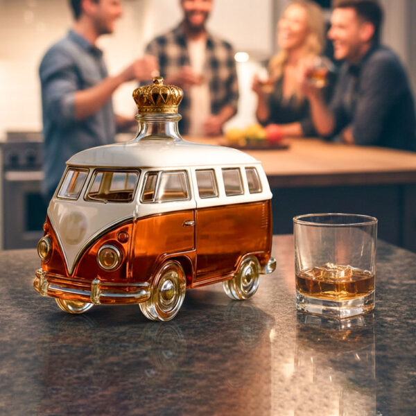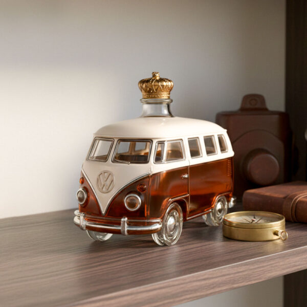 The subtle color contrast running along the body mimics those classic paint schemes that once rolled through desert sunsets and coastal highways. It's not painted—it's molded into the glass itself, giving depth and dimension that flat decanters can't touch. When light hits those lines, it looks like the decanter is still cruising down some forgotten stretch of asphalt.