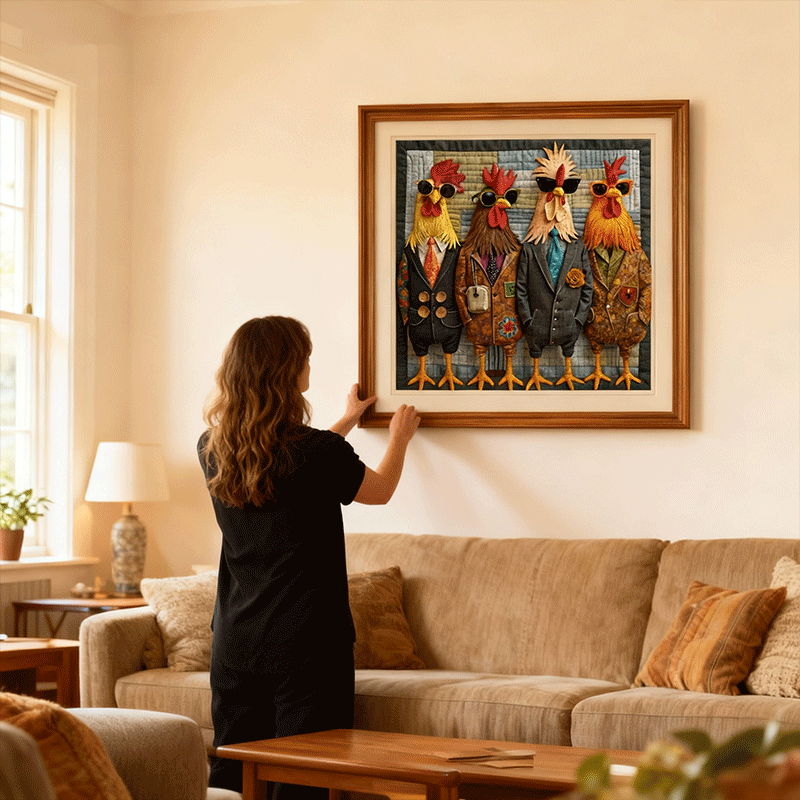 The surface features vibrant, high-definition printing that makes every rooster come alive with personality.