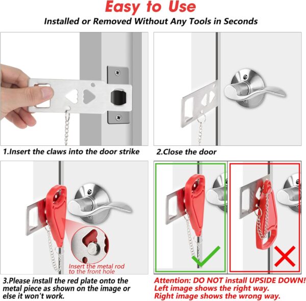 No fumbling with screws or searching for tools. Simply slide the metal piece into the door latch strike plate, close the door, and snap the handle into place. That's it. Even if you're exhausted after a long flight or it's pitch black in the room, installation is foolproof. The design is so intuitive that you'll have it secured before your luggage hits the floor.