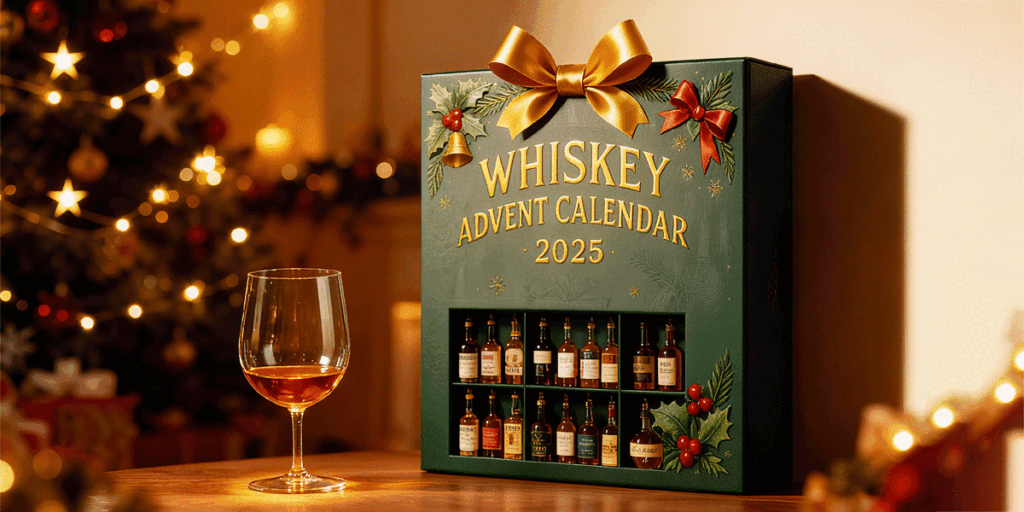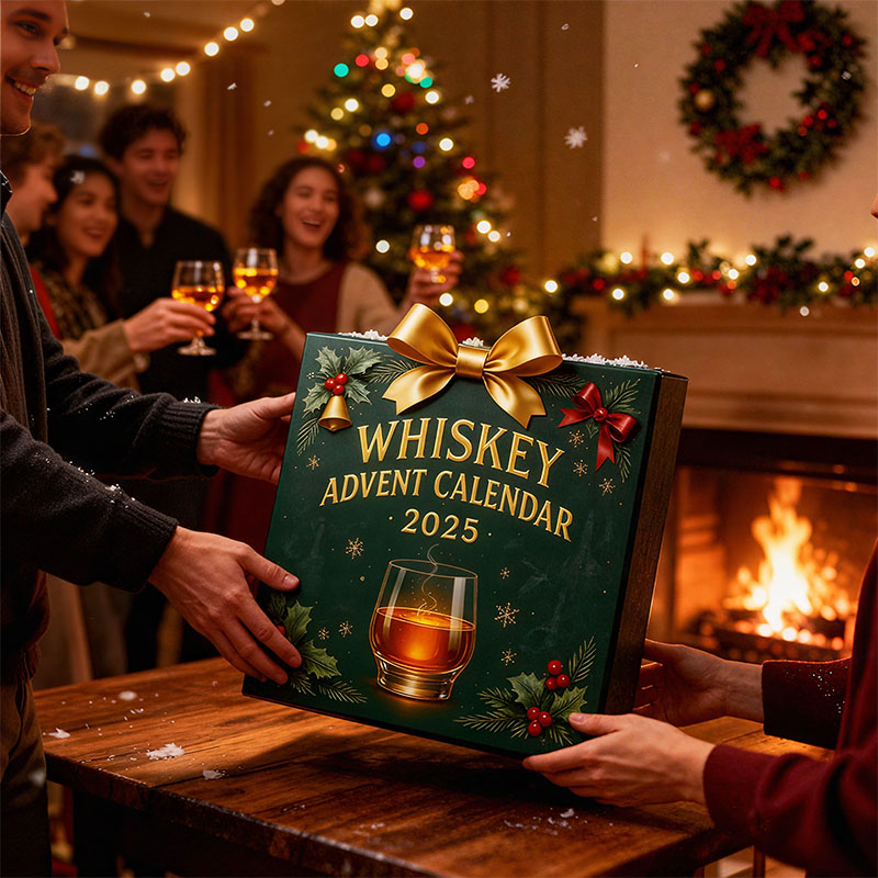It’s a 24-day advent-style countdown featuring miniature whiskey-inspired bottle ornaments. Each day reveals a new collectible mini bottle design influenced by famous whiskey styles and label traditions. These are designed collectibles, not drinkable alcohol samples.