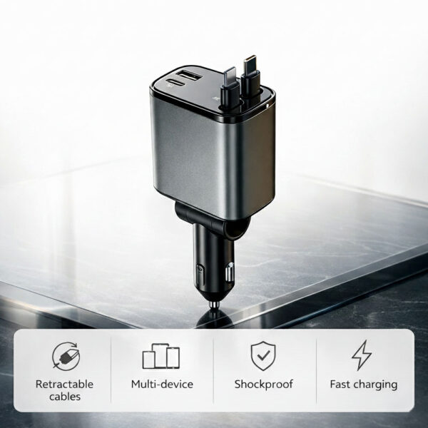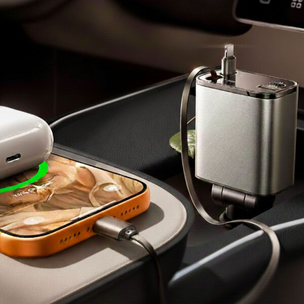 The smooth exterior wipes clean easily with a damp cloth or baby wipe—no crevices where crumbs and sticky residue can hide. If juice gets on the retractable cables, wipe them down before retracting to avoid getting the interior mechanism sticky. The cable housing is sealed, so minor spills won't damage the electronics inside. For parents, the auto-retract feature is actually a lifesaver because cables aren't left dangling where kids can grab them with messy hands. Just do a quick wipe-down during your weekly car cleanup, and it'll stay looking new. Avoid submerging it in water or spraying directly into the ports, but surface cleaning is totally safe.