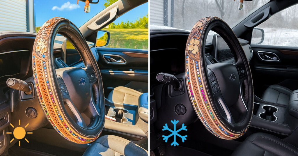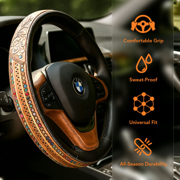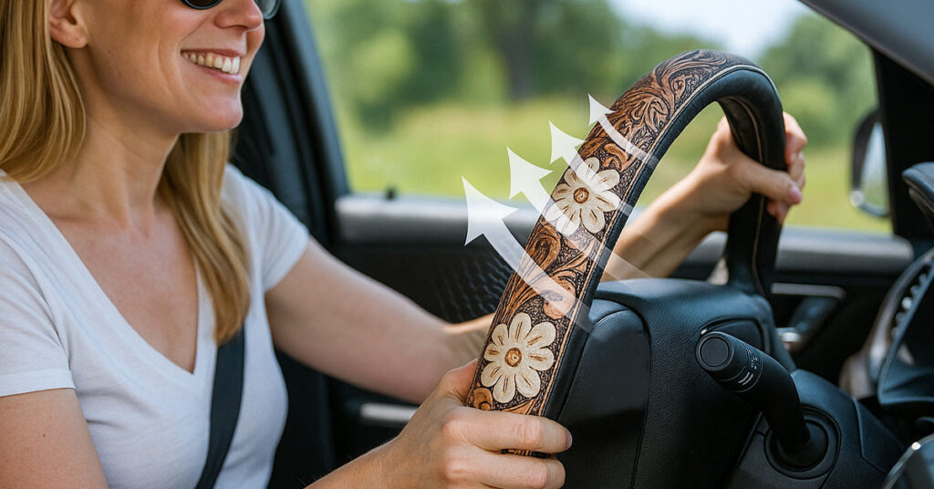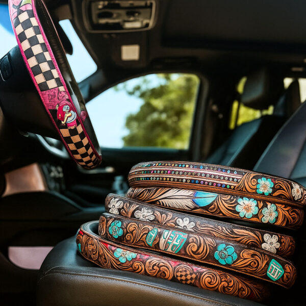 SpiritGrip is a handcrafted leather steering wheel cover inspired by Western artistry. With detailed floral, feather, and retro motifs, it transforms your wheel into a piece of personality and adventure—bringing comfort, grip, and timeless style to every drive.