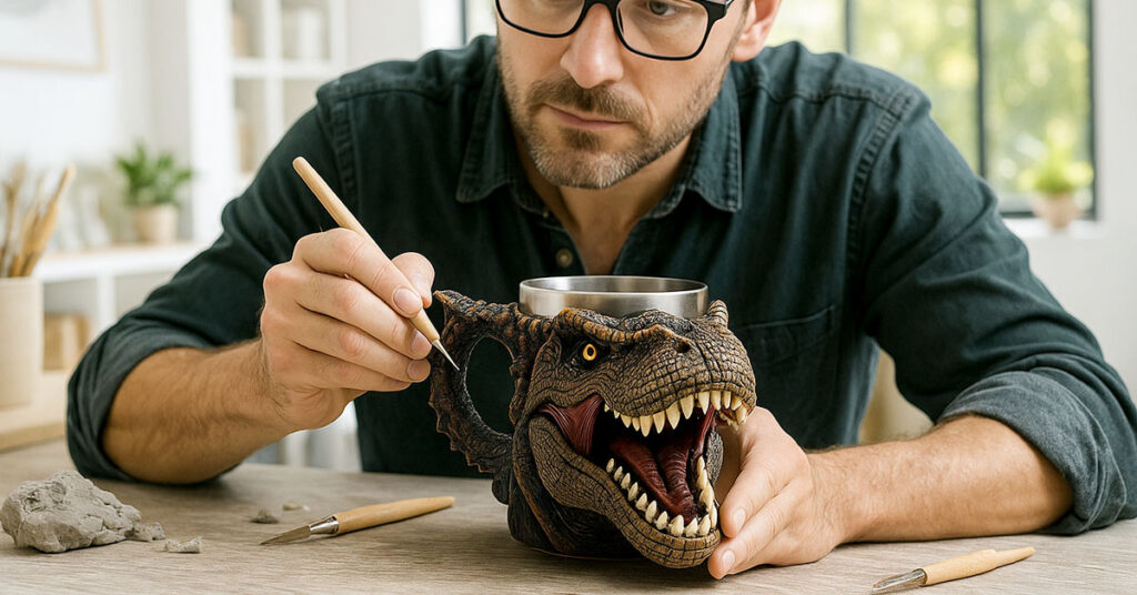 The hand-painted details are designed to be durable and withstand regular use. However, for best results, we recommend hand-washing with mild soap rather than putting it in the dishwasher. This helps preserve the intricate T-Rex features and keeps the mug looking fierce for years to come.
