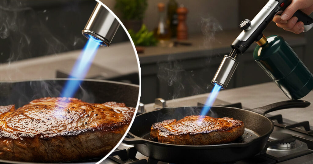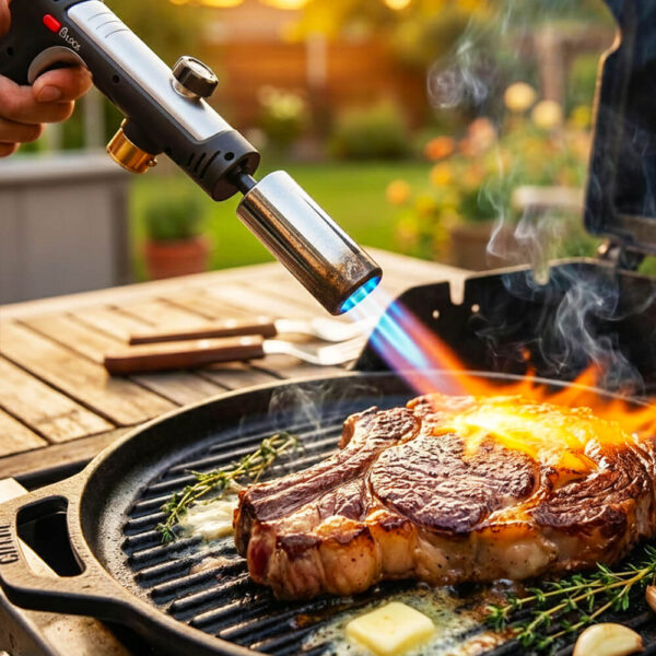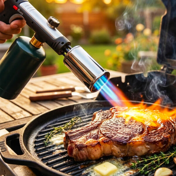 The torch itself works indoors, but using a 3272°F flame inside creates smoke and requires serious ventilation. Most people torch steaks outside on their deck or patio, or finish them under a range hood on high. If you're in an apartment, torch them on a balcony or near an open window. The speed helps—you're talking 15-30 seconds per side, not prolonged exposure.