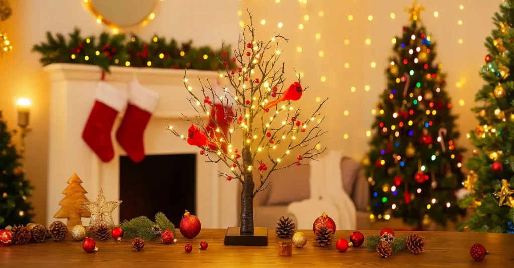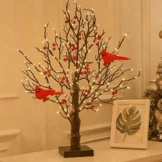 The Tree of Life is no ordinary décor piece—it’s a living story captured in light. Branches kissed with glowing berries, two cardinals perched gracefully, and a warm golden glow weaving through every twig.