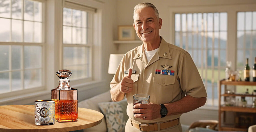 Each glass is crafted from thick, lead-free crystal with a weighted base for durability and a premium feel. It features gold-embossed military emblems and mottos, making it a meaningful tribute to honor veterans’ service.