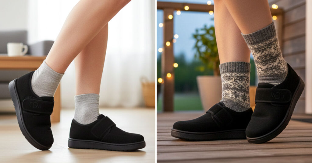 The velcro strap adjusts easily throughout the day. If your feet are less swollen in the morning, tighten the strap a bit. When they puff up later, loosen it in seconds without taking the shoes off. The flexible design accommodates natural changes in foot size without pinching or feeling loose.