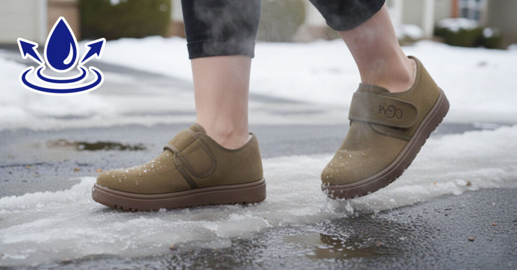 Wet shoes pull heat away fast and leave you shivering for hours. The water-repellent outer layer keeps rain, melting snow, and puddle splashes from soaking through. Water beads up and rolls right off the surface, while the felt-like material blocks wind but still lets moisture escape from inside. Your socks stay dry, your feet stay warm, and you stay comfortable from start to finish.