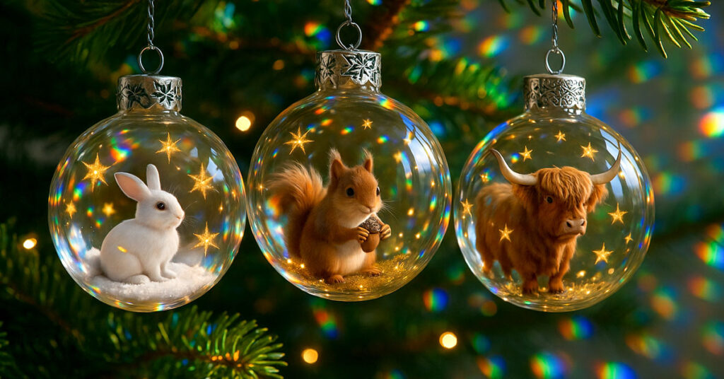 Every whisker, branch, and snowflake is carefully shaped by hand. The Highland cow's shaggy fur seems to move in light, while the fox's alert expression feels ready to turn at any moment. Pine needles and snowflakes are individually crafted with precision that makes each ornament feel less like decoration and more like a living creature captured in glass. The fine details often make children ask if the animals are real.