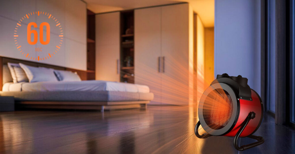 Most users feel warmth in under 60 seconds. The PTC heating element begins producing steady heat almost immediately, ideal for bedrooms, offices, living rooms, and small-to-medium spaces.