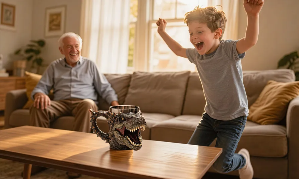 “Grandpa, you really did it! Is this a dinosaur mug? I’ve never seen anything like it!”