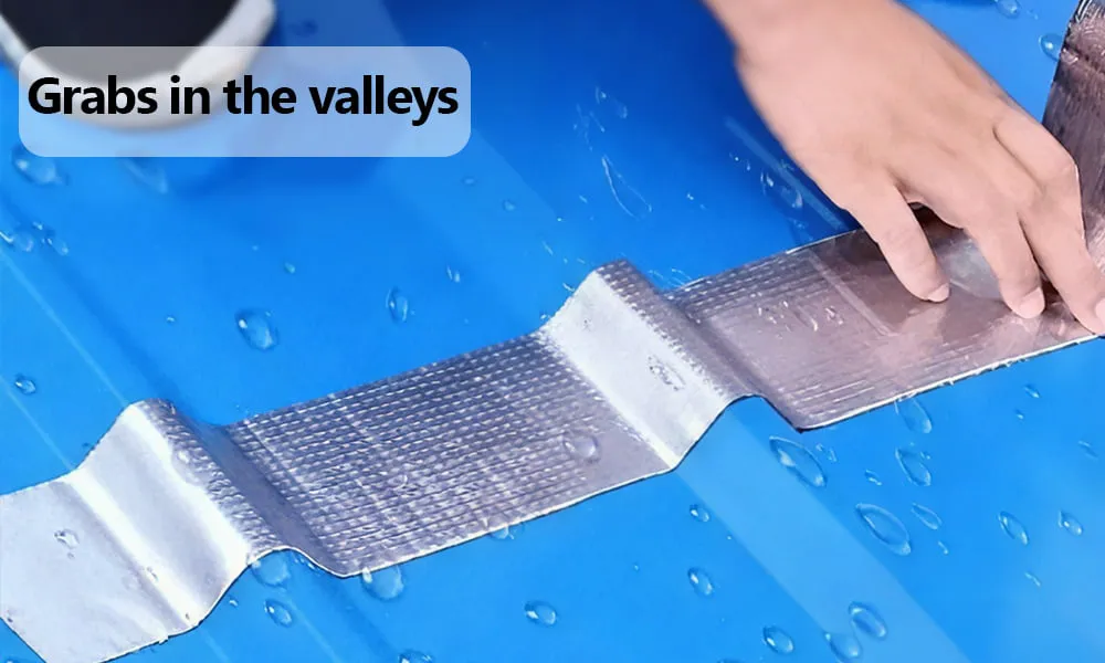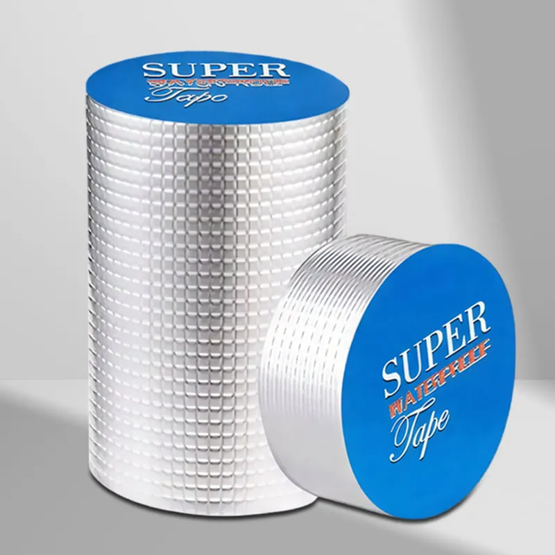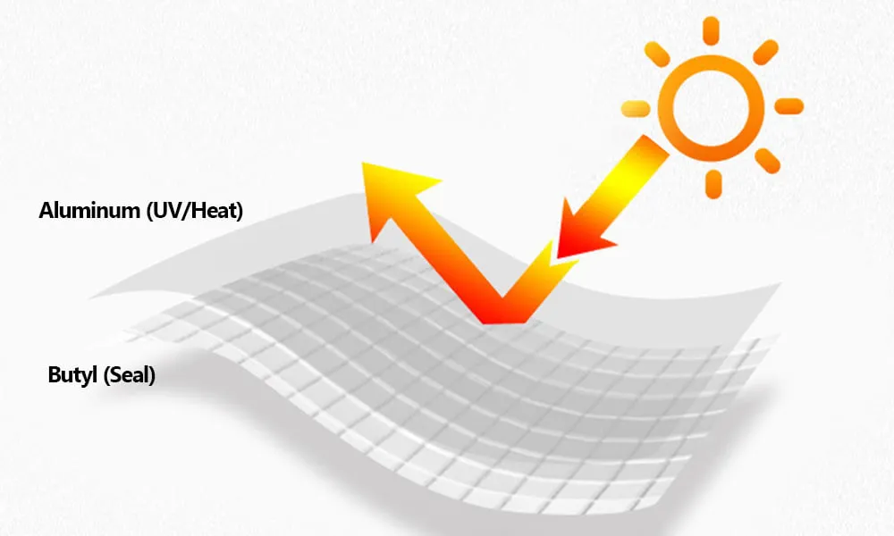 The top layer is pure aluminum film for UV resistance, corrosion protection, and light heat reflection; the butyl core below does the sealing.