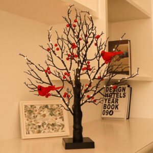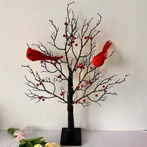 Shaped like a blossoming tree, its branches bend freely to your imagination. Red berries glisten among the twigs, while two cardinals perch gracefully, frozen in a perfect moment of nature.